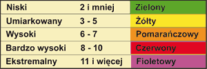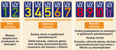 - legenda poziomu i zakresu Indeksu UV oraz objaśnienia