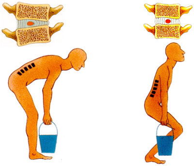 Pozycja ciała przyjmowana podczas pracy zdeterminowana jest poprzez zależności pomiędzy przestrzenną konstrukcją stanowiska pracy, wykonywanymi czynnościami oraz wymiarami antropometrycznymi pracownika. Optymalną pozycję ciała zapewnia dostosowanie przestrzennej konstrukcji stanowiska pracy do wymiarów antropometrycznych pracownika, tak aby nie stwarzać konieczności utrzymywania przez pracowników niewygodnych pozycji jak np. skręt czy pochylenie ciała. Pochylenie kręgosłupa powoduje zmianę rozkładu sił w krążkach międzykręgowych. Przy wyprostowanym kręgosłupie siły rozłożone są równomiernie. W przypadku pochylenia od strony wewnętrznej wartości sił ściskających są znacznie większe niż od strony zewnętrznej (rys.1).