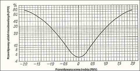 Dla danej wartości PMV można ponadto określić wskaźnik PPD, tj. przewidywany odsetek osób niezadowolonych, a więc oceniających zdecydowanie negatywnie badane środowisko termiczne [1, 2, 3). W tym celu wykorzystywany jest wzór lub wykres opracowany na podstawie badań 1300 osób [2,7], a następnie przeniesiony do normy [9], Z uwagi na indywidualne różnice w odczuwaniu mikroklimatu, nie jest możliwe, aby wszystkie osoby przebywające w danym środowisku, w którym stworzono warunki komfortowe (tj. - 0,5<PMV<+0,5), zgodnie oceniały je jako satysfakcjonujące. Analityczny związek między udziałem niezadowolonych PPD i PMV przedstawiono na wykresie (rys.2.). Wynika z niego, że 90% osób przebywających w pomieszczeniu, ocenia jego środowisko jako komfortowe, dla pozostałych 10% jest ono zimne (5%) lub gorące (5%) [2,9].
