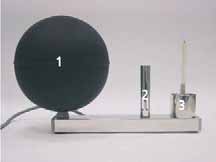 Rys. 3. Zestaw czujników do pomiaru wartości parametrów powietrza w warunkach jednorodnych: 1 – czujnik temperatury poczernionej kuli; 2 – czujnik suchej temperatury powietrza; 3 – czujnik temperatury powietrza w stanie wilgotnym