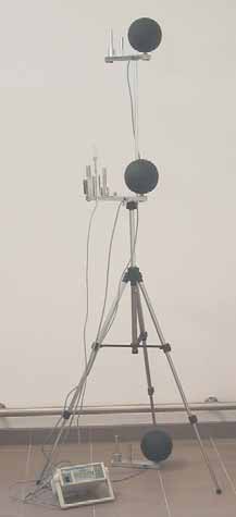 - Pomiar parametrów mikroklimatu środowiska na analizowanym stanowisku (stanowiskach) pracy, tj.: temperatury powietrza ta, prędkości powietrza va, ciśnienia cząstkowego pary wodnej pa, wilgotności względnej powietrza RH, temperatury promieniowania przegród oraz wyposażenia pomieszczenia tr, temperatury poczernionej kuli tg Zestawy czujników do pomiarów parametrów powietrza w środowisku jednorodnym przedstawiono na rys. 3., natomiast w odniesieniu do środowiska niejednorodnego - 3 zestawy tych czujników przestawiono na rys. 4.