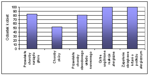 Spośród zdefiniowanych chorób zawodowych można wybrać takie grupy chorób, na które w większości przypadków cierpią kobiety (rys. 2). Do chorób tych można zaliczyć: