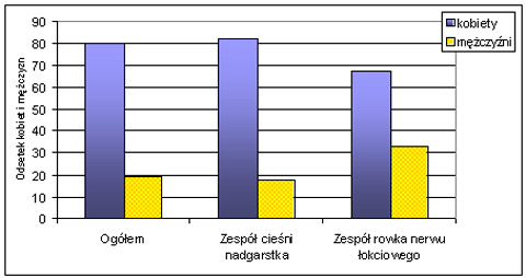 Analizując szczegółowo choroby obwodowego układu nerwowego wywołane sposobem wykonywania pracy (rys. 3), można zauważyć, że zarówno w przypadku zespołu cieśni nadgarstka, jak i zespołu rowka nerwu łokciowego, zdecydowanie większy odsetek zachorowań występuje u kobiet niż u mężczyzn.