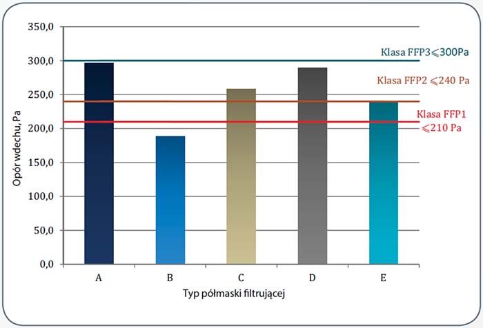 Na rys. 2. przedstawiono wyniki badań półmasek filtrujących w zakresie oporu oddychania w fazie wdechu oraz wymagania w tym zakresie dla klasy FFP1, FFP2 i FFP3.