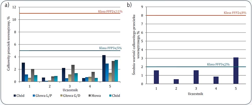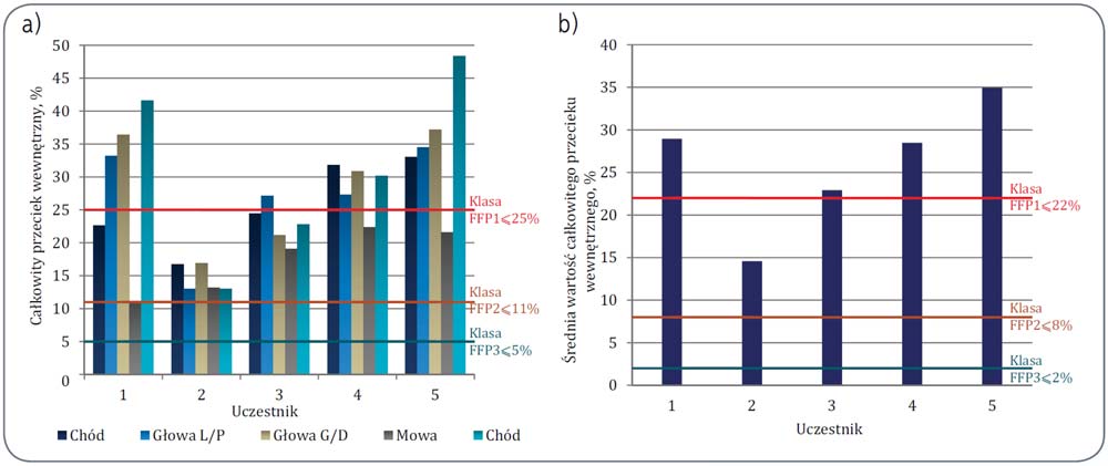 Badania całkowitego przecieku wewnętrznego powinny wykazać, że półmaska filtrująca z dużym prawdopodobieństwem może być stosowana do ochrony przed spodziewanym potencjalnym zagrożeniem. Na rys. 3a) -7a) widać, jak półmaska dopasowuje się do twarzy każdego użytkownika podczas wykonywania poszczególnych ćwiczeń na bieżni w komorze. Najniższe wartości poniżej linii granicznej świadczą o bardzo dobrym dopasowaniu części twarzowej do twarzy użytkownika. Najwyższe wartości powyżej linii granicznej świadczą o niedopasowaniu półmaski do twarzy użytkownika na skutek jej rozszczelnienia w wyniku wykonywanych ćwiczeń. Jeżeli jakikolwiek wynik z cyklu ćwiczeń przekroczy wartość linii granicznej, to należy uznać, że taka półmaska jest niedopasowana do wymiarów twarzy użytkownika.