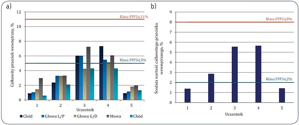 Rys. 4. Zestawienie wartości uzyskanych podczas pomiarów całkowitego przecieku wewnętrznego dla półmaski filtrującej SMOG X210SV PM 2.5 (B): a) w stosunku do pojedynczych wyników ćwiczeń, b) w stosunku do średnich arytmetycznych wyników ćwiczeń