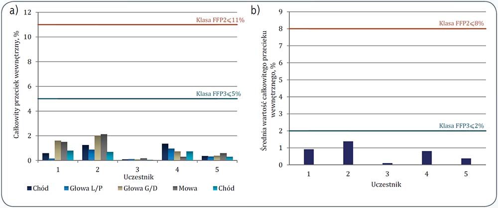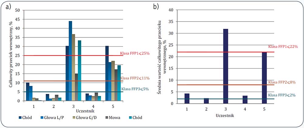 Wykresy przedstawione na rys. 3b) -7b), pokazują średnie wartości całkowitego przecieku wewnętrznego w odniesieniu do poszczególnych uczestników badań. Wyniki przekraczające linię graniczną 8% w przypadku klasy FFP2 i 22% w przypadku klasy FFP1 świadczą o niedopasowaniu półmaski do twarzy użytkownika w danej klasie ochrony. W związku z tym, przy wyborze odpowiedniej półmaski do twarzy użytkownika należy brać pod uwagę zarówno pojedyncze wyniki badań, przedstawione na rys. 3a) -7a), jak i średnie arytmetyczne ćwiczeń, przedstawione na rys. 3b) -7b).