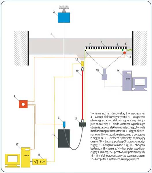 (1 - rama nośna stanowiska, 2 - wyciągarka, 3 - zaczep elektromagnetyczny, 4 - urządzenie otwierające zaczep elektromagnetyczny i inicjujące pomiar siły, 5 - dioda laserowa sygnalizująca otwarcie zaczepu elektromagnetycznego, 6 - skala mechanicznego ekstensometru, 7 - cięgno ekstensometru, 8 - wskaźnik ekstensometru połączony z cięgnem, 9 - element sprężysty napinający cięgno, 10 - badany podzespół łącząco-amortyzujący, 11 - obciążnik o masie 2 kg, 12 - obciążnik badawczy, 13 - kamera, 14 - komputer współpracujący z kamerą, 15 - przetwornik pomiarowy siły, 16 - filtr dolnoprzepustowy ze wzmacniaczem, 17 - komputer z systemem akwizycji danych)