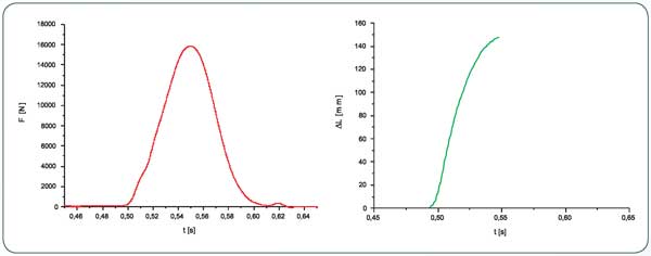 Na rys. 2 przedstawiono przebieg siły, pomierzonej przez przetwornik pomiarowy działającej na obciążnik podczas powstrzymywania jego spadania przez linkę bezpieczeństwa. Analizując przebieg impulsu siły można zauważyć, że proces powstrzymywania spadania obciążnika, czyli fragment, gdzie siła narasta od wartości 0 do Fmax, wynosi około 0,05 s. Na rys. 2. przedstawiono przebieg czasowy wydłużenia badanego obiektu, pomierzony i zarejestrowany za pomocą ekstensometru i kamery. Impuls wydłużenia towarzyszącego powstrzymaniu spadania obciążnika narasta również w czasie około 0,05 s. Wykorzystując ten efekt dokonano powiązania danych przebiegu F (t) i AL (t), to znaczy utworzono pary próbek z tych przebiegów, pobranych w tej samej chwili. Pary te w postaci graficznej tworzą wykres (rys. 3.), który jest charakterystyką F (AL) „siła obciążająca - wydłużenie" zbadanego obiektu określoną dla warunków dynamicznych.