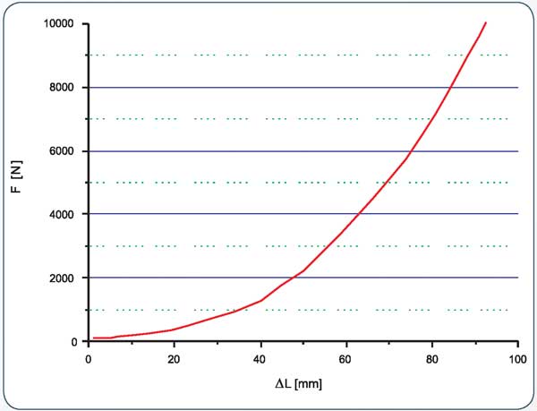 Rys. 3. Charakterystyka „siła obciążająca - wydłużenie" linki bezpieczeństwa wykonanej z taśmy z włókien poliaramidowych o szerokości 45 mm i długości 2000 mm, zakończonej obustronnie zaszytymi pętlami