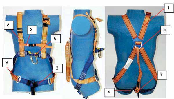 Fot. 1. Typowa konstrukcja szelek bezpieczeństwa: 1 - pas barkowy, 2 - pas udowy, 3 - pas piersiowy (pomocniczy), 4 - „siodełko", 5 - zaczep grzbietowy, 6 - zaczep piersiowy, 7 - łącznik zaczepu grzbietowego, 8 - klamra regulacyjna pasa barkowego, 9 - klamra spinająco-regulacyjna pasa udowego