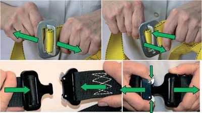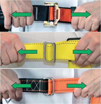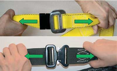 W podobny sposób należy sprawdzić, czy klamry regulacyjne prawidłowo blokują taśmę włókienniczą. Zgodnie z fot. 11. należy szarpnąć za oba odcinki pasów, obserwując, czy taśma nie przesuwa się w klamrze regulacyjnej.