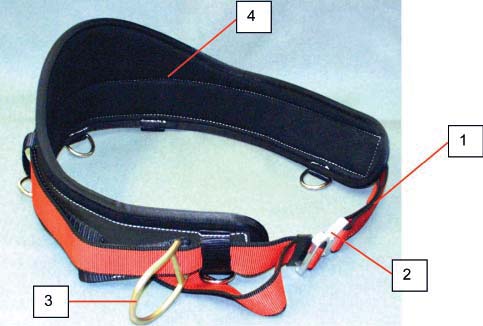 Fot. 2. Typowa konstrukcja pasa do ustalania pozycji podczas pracy na wysokości: 1 - pas biodrowy, 2 - klamra spinająco-regulacyjna, 3 - boczna klamra zaczepowa, 4 - poduszka przeciwuciskowa