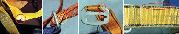 Przy sprawdzania stanu technicznego uprzęży należy, po pierwsze, dokonać oceny wzrokowej elementów włókienniczych, takich jak taśmy, łączące je szwy, poduszki przeciwuciskowe itp., pod kątem występowania dyskwalifikujących uszkodzeń. Przeglądając taśmy włókiennicze należy zwrócić szczególną uwagę na takie ich uszkodzenia, jak: