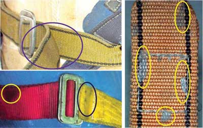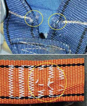 Bardzo istotne z punktu widzenia bezpieczeństwa są przetarcia i poprucia szwów łączących taśmy włókiennicze. Uszkodzenia te, których przykłady przedstawiono na fot. 4., mogą w istotny sposób obniżać wytrzymałość całej uprzęży, co jest szczególnie niebezpieczne podczas powstrzymywania spadania z wysokości. Praktyka stosowania uprzęży w warunkach przemysłowych wskazuje, że uszkodzenia szwów są jednymi z najczęściej występujących uszkodzeń mechanicznych.