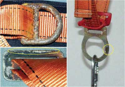 Fot. 7. Przykłady korozji metalowych klamer szelek bezpieczeństwa