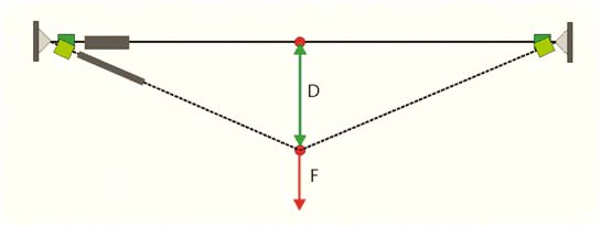 Rys. 5. Schemat obciążania jednoprzęsłowego urządzenia kotwiczącego z elastyczną prowadnicą w badaniach odporności na obciążenie statyczne oraz odporności na obciążenie dynamiczne i integralności konstrukcji: a - prowadnica elastyczna, b - amortyzator, c - przetwornik pomiarowy siły, d - skrajny element kotwiczący, F - siła obciążająca, D - ugięcie prowadnicy