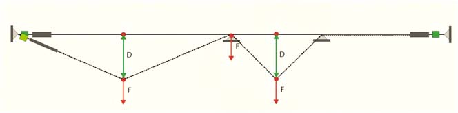 Rys. 7. Schemat obciążania wieloprzęsłowego urządzenia kotwiczącego z elastyczną prowadnicą i łukiem w badaniach odporności na obciążenie statyczne oraz odporności na obciążenie dynamiczne i integralności konstrukcji; a - prowadnica elastyczna, b - amortyzator, c - skrajny element kotwiczący, d - pośredni element kotwiczący, e - łuk, f - przetwornik pomiarowy siły, F - siła obciążająca, D - ugięcie prowadnicy