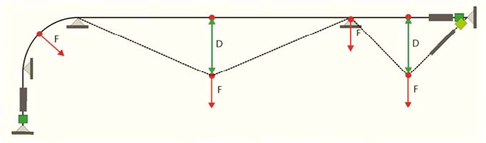 Problemem urządzeń, w których jako prowadnice są wykorzystywane liny lub taśmy wykonane z włókien poliamidowych lub poliestrowych, jest ich relatywnie duże wydłużanie się. Skutkiem takiej sytuacji jest długa droga powstrzymywania spadania zabezpieczanego pracownika. Metodą redukcji wydłużenia prowadnicy jest stosowanie przęseł pośrednich, umieszczanych pomiędzy przęsłami skrajnymi, tak jak pokazano to na rys. 2.