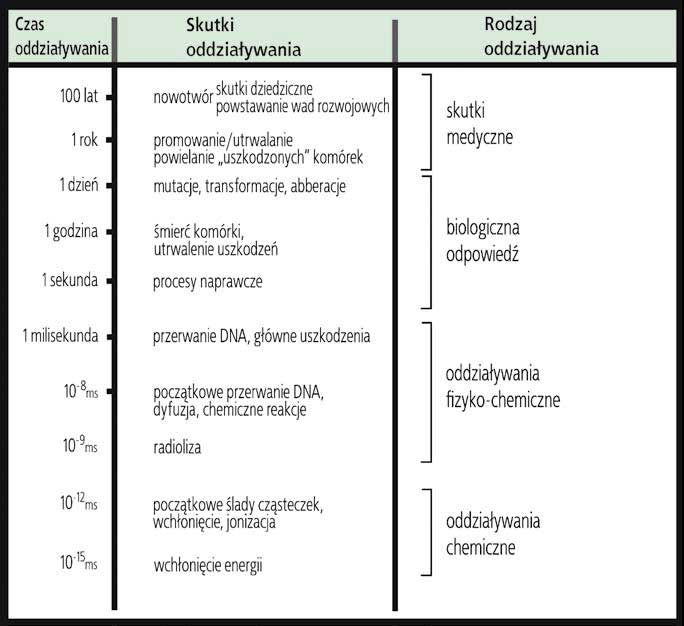 Na rysunku wyróżniono w skali czasu kilka faz, w trakcie których następują po sobie popromienne skutki wraz z rodzajem oddziaływania promieniowania rentgenowskiego na organizm żywy. Pierwszą zmianą w materiale biologicznym jest wchłonięcie przez żywą tkankę energii promieniowania, która powoduje jonizację albo wzbudzenie cząsteczek i atomów, a te wyzwalają następnie łańcuch wtórnych reakcji biologicznych [3].