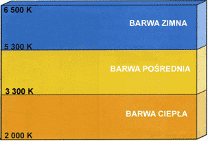 Barwę światła określa się za pomocą tzw. temperatury barwowej (Tc) i podaje się ją w kelwinach [K]. Źródła, które emitują białą barwę światła można podzielić, w zależności od ich temperatury barwowej, na trzy grupy: ciepła (poniżej 3 000 K), neutralna (pośrednia) (od 3 300 do 5 300 K) i chłodna (zimna) (powyżej 5 300 K do 6 500 K). Wraz ze wzrostem wartości średniej wymaganego natężenia oświetlenia powinna wzrastać wartość temperatury barwowej stosowanych źródeł światła.