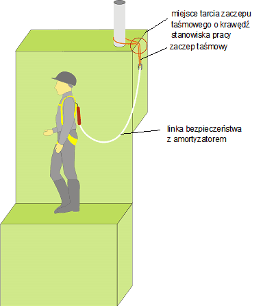 Efekt taki występuje również w przypadku zakotwiczenia np. linki bezpieczeństwa z amortyzatorem lub prowadnicy urządzenia samozaciskowego na stanowisku pracy w pobliżu niebezpiecznego obiektu o ostrych krawędziach. Wówczas podczas przemieszczania się użytkownika może dochodzić do ocierania się elementów włókienniczych sprzętu o ostre krawędzie i powstawania uszkodzeń. Przykład takiej sytuacji przedstawiono na rys. 3 gdzie podczas przemieszczania się użytkownika zaczep taśmowy trze o krawędź stanowiska pracy.