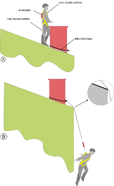 A – stan przed spadaniem, B – stan po powstrzymaniu spadania