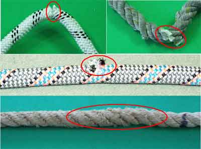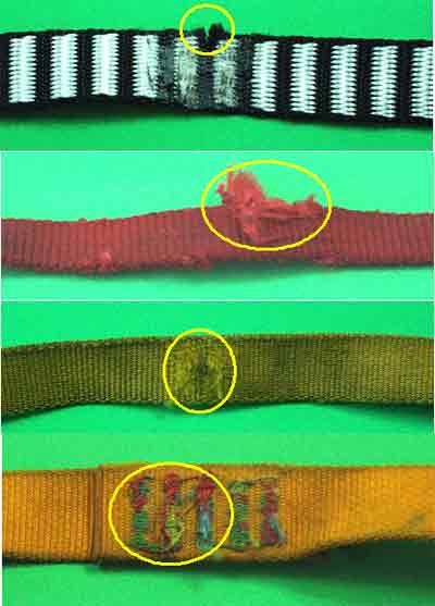 Przykłady uszkodzeń mechanicznych lin i taśm włókienniczych typu: