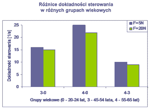 Najmniejsze różnice pomiędzy różnymi grupami wiekowymi dotyczyły dokładności sterowania. Zmniejszenie wraz z wiekiem dokładności sterowania było mniejsze niż w przypadku parametrów statycznych, czy dynamicznych (Rys.5) [5].