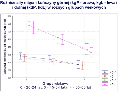Osoby w wieku powyżej 45. roku życia mają znacznie mniejsze wartości sił prostujących i zginających stawy, zwłaszcza podczas czynności, w których wykorzystywane są duże grupy mięśniowe (kończyny dolne i tułów).