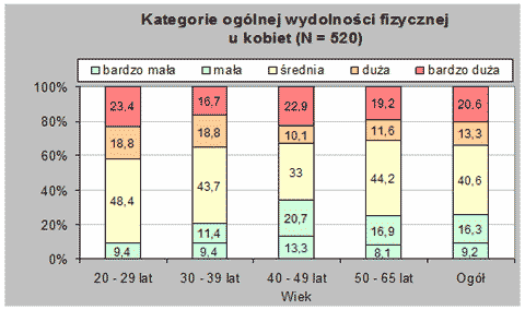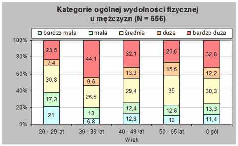 - Niepokojące jest, że stosunkowo duży odsetek młodych mężczyzn w wieku 20 – 29 lat ma, zgodnie z przyjętą klasyfikacją Astranda, bardzo małą lub małą wydolność fizyczną – ponad 38% wszystkich badanych w tej grupie wiekowej [2].