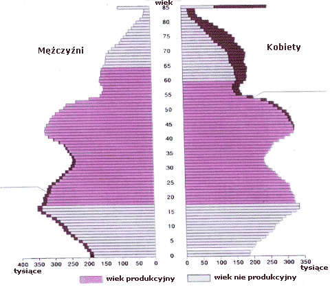Rys. 1 Przekrój wiekowy ludności Polski w podziale ze względu na płeć (w roku 2000).