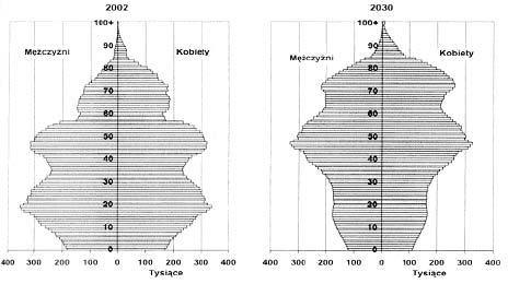 Rys. 2. Prognoza przekroju wiekowego ludności Polski przewidiwanego na rok 2030 w porównaniu z rokiem 2002. (źródło: opracowanie Ireny E. Kotowskiej /SGH/ na podstawie danych GUS z 14.04.2004 r.)