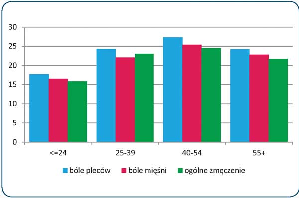 Rys. 1. Dolegliwości mięśniowo-szkieletowe u pracowników UE (27) w różnych grupach wiekowych [1]