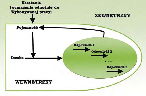 Amstrong i współpracownicy [2] opracowali model powstawania parazawodowych chorób i dolegliwości układu mięśniowo-szkieletowego szyi i kończyn górnych. Jest on oparty na czterech współdziałających zmiennych: narażeniu, dawce, pojemności i odpowiedzi, które są miernikami stanu układu mięśniowo-szkieletowego systemu w określonym czasie. Odpowiedź na jedną ze współdziałających zmiennych może stanowić dawkę na następnym poziomie (rys. 2.). Ten model odzwierciedla wieloczynnikową naturę rozwoju dolegliwości oraz złożoną naturę zależności między zmiennymi narażenia, dawki, pojemności i reakcji.