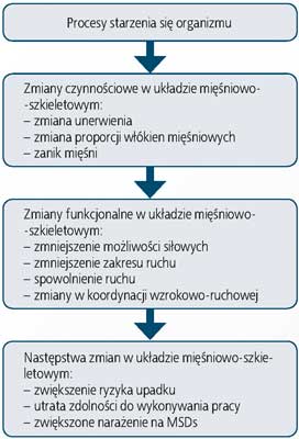 Ze względu na to, że procesowi starzenia towarzyszy stopniowa utrata funkcji mięśni, osoby starsze są bardziej narażone na występowanie MSDs, będąc pod wypływem obciążenia nadmiernym wysiłkiem bądź zmęczeniem. Wywołane wiekiem straty w gęstości mineralnej kości, sile mięśni, utrzymywaniu równowagi (co wpływa także na zmianę właściwości chodu) są związane ze zwiększonym ryzykiem upadków i złamań, niepełnosprawności i śmiertelności. Jednak, pomimo że proces starzenia jest zjawiskiem nieuniknionym w odniesieniu do wszystkich organizmów żywych, u różnych osób zachodzi z różną intensywnością. Jest oczywiste, że występuje znaczne zróżnicowanie w częstości, tempie i zakresie zmian różnych parametrów, opisujących zdrowotne i funkcjonalne właściwości różnych struktur organizmu człowieka. Współczesna wiedza potwierdza, że zarówno rozwój różnego typu chorób, jak i intensywność zmian spowodowanych wiekiem, są zależne nie tylko od uwarunkowań genetycznych, ale także od sposobu życia. Szczególne znaczenie ma sposób odżywiania się oraz dobór określonych ćwiczeń fizycznych.