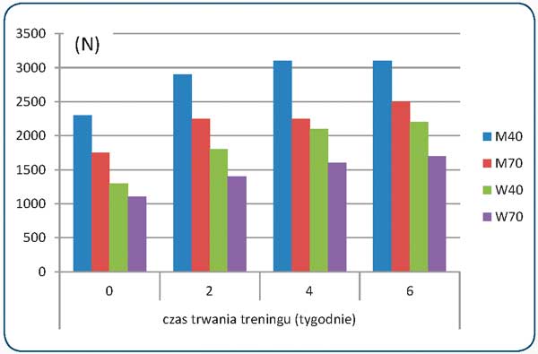 Rys. 5. Zmiana wartości maksymalnej siły prostowania kolana pod wpływem treningu [7] (siła wywierana w warunkach izometrycznych). M40 - mężczyźni w grupie wiekowej czterdziestolatków; W40 - kobiety w grupie wiekowej czterdziestolatków; M70 - mężczyźni w grupie siedemdziesięciolatków; W70 - kobiety w grupie wiekowej siedemdziesięciolatków