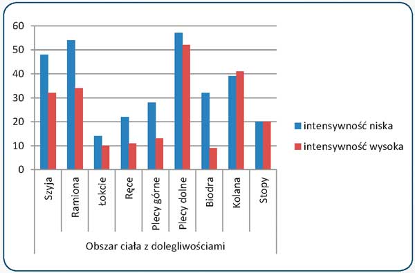 Regularna aktywność fizyczna jest jednym z czynników prewencji w odniesieniu do wielu chorób przewlekłych. Systematyczne uprawianie treningu jako formy spędzania wolnego czasu przyczynia się do zmian funkcjonalnych zachodzących w organizmie oraz stanowi środek przeciwdziałający i opóźniający procesy niszczące [9]. Aktywność fizyczna zmniejsza także częstość występowania MSDs, co zostało potwierdzone badaniami Morken i innych [10]. Na podstawie badań kwestionariuszowych wyspecyfikowano grupy osób podejmujących wysiłek fizyczny o małej intensywności (grupa osób badanych o liczebności 308) i o dużej intensywności (grupa o liczebności 481). Wysiłek został sklasyfikowany na podstawie jego intensywności oraz częstości wykonywania. Ponadto, na podstawie kwestionariusza, w każdej grupie określono procent populacji uskarżających się na dolegliwości w różnych częściach ciała. Na rys. 6. przedstawiono wyniki tych badań.