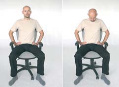 Opis: Usiądź prosto na krześle. Ręce oprzyj na biodrach. Zginaj głowę do przodu, skieruj wzrok na mostek, trzymaj kilka sekund, wyprostuj głowę. Pamiętaj: Ćwiczenia wykonuj płynnie i powoli. Serie: Jedna seria 2-3 razy dziennie (jedna seria obejmuje 10 powtórzeń) Rozciągnięcie mięśni tylnej strony karku, mobilizacja ruchomości szyi. |