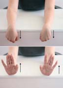 Opis: Usiądź na krześle. Zegnij ręce w stawach łokciowych i stawach nadgarstkowych. Ręce oprzyj na podłokietnikach krzesła lub na blacie stołu, tak żeby ręce wystawały poza powierzchnią podparcia. Zegnij grzbietowo dłonie w stawie nadgarstkowym. Dłoń opuść w dół i zaciśnij mocno pięść. Postaraj się unieść dłoń w górę i wyprostować palce. Liczba powtórzeń: 15-20 Serie: 2 (jedna seria obejmuje 15-20 powtórzeń) Poprawienie ruchomości stawów nadgarstkowych i ręki. |