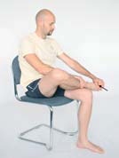 Opis: Usiądź wygodnie na krześle. Stopę, którą chcesz rozciągać, połóż na kolanie drugiej stopy. Jedną ręką przytrzymuj nad kostką rozciąganą nogę, a drugą ręką chwyć za przednią część stopy. Poruszaj stopą w kierunku jej rozciągnięcia do momentu pojawienia się uczucia rozciągania na przedniej stronie podudzia i górnej i zewnętrznej stronie stopy. Liczba powtórzeń: 5-10; 10-20 s rozciągnięcia Rozciągnięcie o znacznym natężeniu mięśni przedniej strony podudzia, górnej i zewnętrznej strony stopy. |