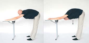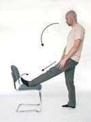 Opis: Oprzyj jedną nogę o krzesło, palce stopy postaraj się przyciągnąć do siebie. Utrzymaj wyprostowaną nogę, następnie powoli wykonaj skłon tułowia w przód. Wytrzymaj około 10 s, wróć do pozycji wyjściowej. Ćwiczenie staraj się wykonywać powoli. Liczba powtórzeń: 10 Uelastycznienie i rozciągnięcie odcinka lędźwiowego kręgosłupa oraz mięśni tylnej części nogi. |
