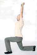 Opis: Wykonaj z pozycji stojącej krok jedną nogą do przodu i klęknij na drugiej nodze. Unieś wyprostowane w stawach łokciowych ręce nad głowę i postaraj się wyprostować plecy. Wypnij powoli do przodu klatkę piersiową, wytrzymaj 5-10 sekund. Liczba powtórzeń: 5-10 Uczucie rozciągnięcia odczuwane na przedniej stronie tułowia, zwłaszcza w dolnej partii jamy brzusznej i przedniej stronie uda nogi, na której klęczysz. |