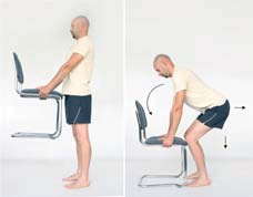 Opis: Stań wyprostowany z lekko ugiętymi kolanami. W rękach trzymaj niezbyt ciężki duży przedmiot (np. krzesełko). Powoli pochyl tułów do przodu, plecy trzymaj prosto, ugnij kolana, a pośladki wypchnij do tyłu. Krzesło opuść pionowo w dół, nie stawiaj go na podłodze. Pamiętaj: 1) Ćwiczenie postaraj się wykonywać płynnie i powoli. 2) Mięśnie brzucha trzymaj napięte. 3) Prawidłowo wykonane ćwiczenie powinno się odbywać w stawach biodrowych, a nie w stawach kręgosłupa. Liczba powtórzeń: 10-20 Długość przerw: 60-90 s pomiędzy seriami Oczekiwany efekt: Wzmocnienie mięśni odcinka lędźwiowego kręgosłupa, pośladków i przedniej strony ud.