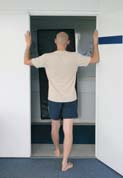 Opis: Stań w lekkim rozkroku w futrynie drzwi, tułów i głowę trzymaj prosto, wypchnij klatkę piersiową do przodu. Wytrzymaj kilkanaście sekund i wróć do pozycji wyjściowej. Pamiętaj: 1) W trakcie ćwiczenia postaraj się maksymalnie rozluźnić mięśnie górnej części klatki piersiowej i stawu ramiennego. 2) W celu uzyskania jak najlepszych rezultatów postaraj się wykonywać ćwiczenie regularnie przez dłuższy czas. Liczba powtórzeń: 10; 10-20 s rozciąganie Serie: 3 (jedna seria obejmuje 10 powtórzeń) Długość przerw: 30-60 s pomiędzy seriami Oczekiwany efekt: Rozciągnięcie mięśni piersiowych i mięśni obręczy barkowej |