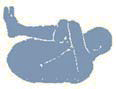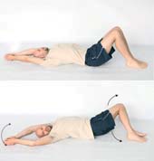 Opis: Połóż się na plecach, nogi ugnij w kolanach, stopy oprzyj na podłodze, ręce wyprostuj i wyciągnij przed siebie. Następnie wykonaj skręt tułowia przez jednoczesne przeniesienie złączonych kolan w jedną stronę, a złączonych rąk w drugą - przeciwną stronę. Wzrok skieruj w kierunku ruchu rąk. Wróć do pozycji wyjściowej, wykonaj ćwiczenie ze zmianą kierunku. Pamiętaj: Postaraj się nie odrywać łopatek od podłoża. Liczba powtórzeń: 10-15 Poprawa ruchomości stawów między kręgowych, po-prawa rotacji kręgosłupa. Znaczny wysiłek mięśni obręczy biodrowej, tułowia i ramion. |