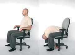 Opis: Usiądź prosto na krześle. Rękami ciągnij oparcie krzesła do klatki piersiowej. Klatkę piersiową wypchnij do przodu, łopatki ściągnij do kręgosłupa. Wypchnij brzuch w przód. Ruch prowadź do uczucia silnego napięcia, przytrzymaj kilka sekund, a następnie rozluźnij całe ciało. Głowę trzymaj prosto, bezpośrednio nad barkami i miednicą. Liczba powtórzeń: 10 Wzmocnienie mięśni grzbietu w odcinku piersiowym. Rozciąganie odcinka lędźwiowego kręgosłupa. |