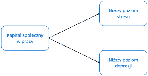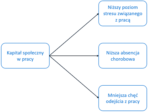 W badaniu prowadzonym wśród pracowników sektora usług pokazano, że im wyższy poziom kapitału społecznego w pracy, tym lepsze samopoczucie: niższy poziom stresu związanego z pracą i niższa absencja chorobowa.