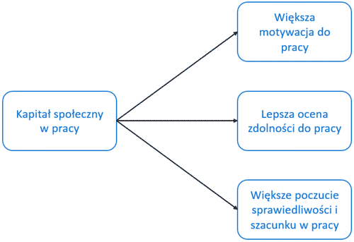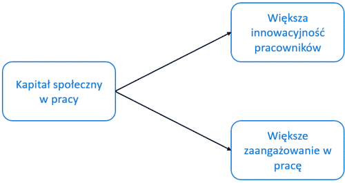 Podobnie, w firmach, gdzie poziom kapitału społecznego jest wysoki, pracownicy są bardziej zaangażowani swoją pracę, rzadziej mają zamiar odejść z pracy i są bardziej innowacyjni.