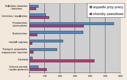 Nowo przyznane renty z tytułu wypadków przy pracy i chorób zawodowych koncentrowały się w 8 sekcjach gospodarki: przetwórstwie przemys łowym, edukacji, budownictwie, górnictwie i kopalnictwie, handlu i naprawach, transporcie, gospodarce magazynowej i łączności, ochronie zdrowia i opiece społecznej oraz w rolnictwie, w których w 2005 r. przyznano 89,4% ogółu nowych rent.